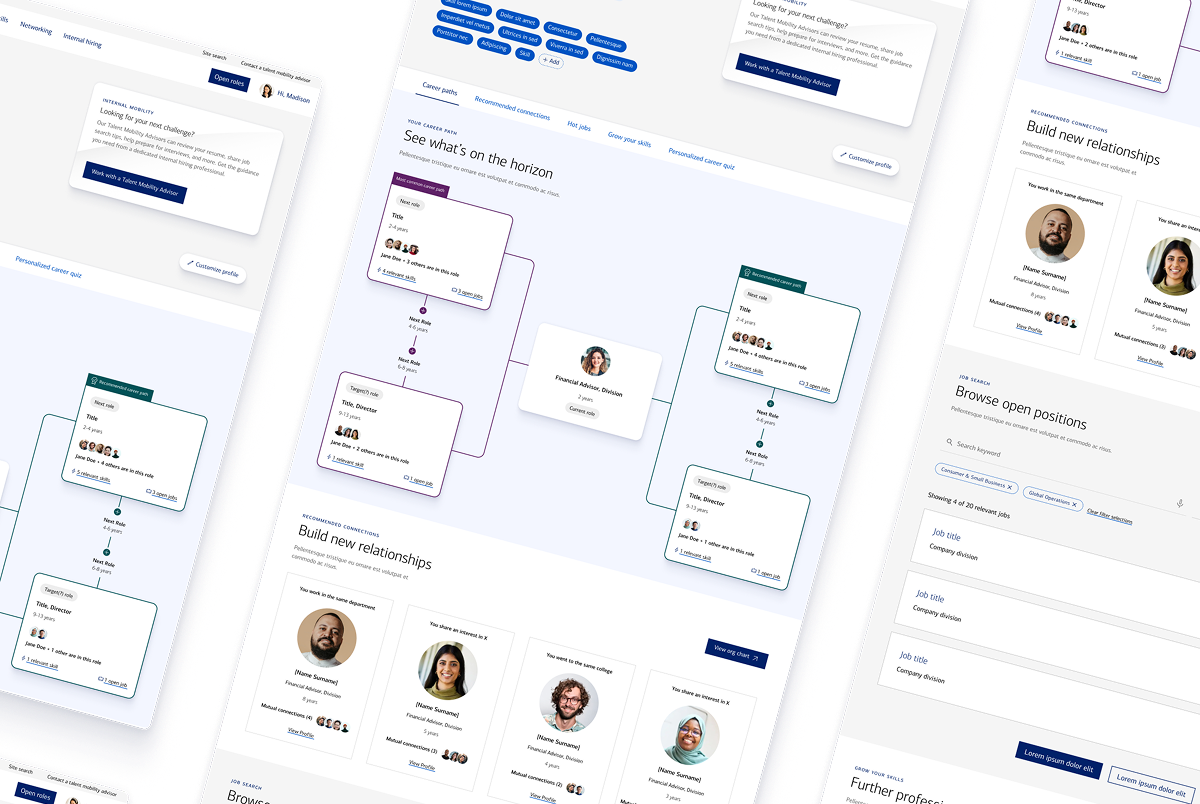 Sometimes the opportunity is bigger than the initial problem. I led a cross-functional team of strategists, designers, and technical product managers, turning an initial ask to visually refresh an internal career site into a broader opportunity to design a platform that truly supported employees in their growth. We designed personalized career hubs, resume analysis tools, and clear pathways for growth, which sparked excitement from stakeholders and executives. I enjoyed presenting the vision to leadership and watching them lean in, asking how quickly they could make parts of it real. We delivered a North Star vision and actionable roadmap, and built an executive case to pursue funding for an MVP.
